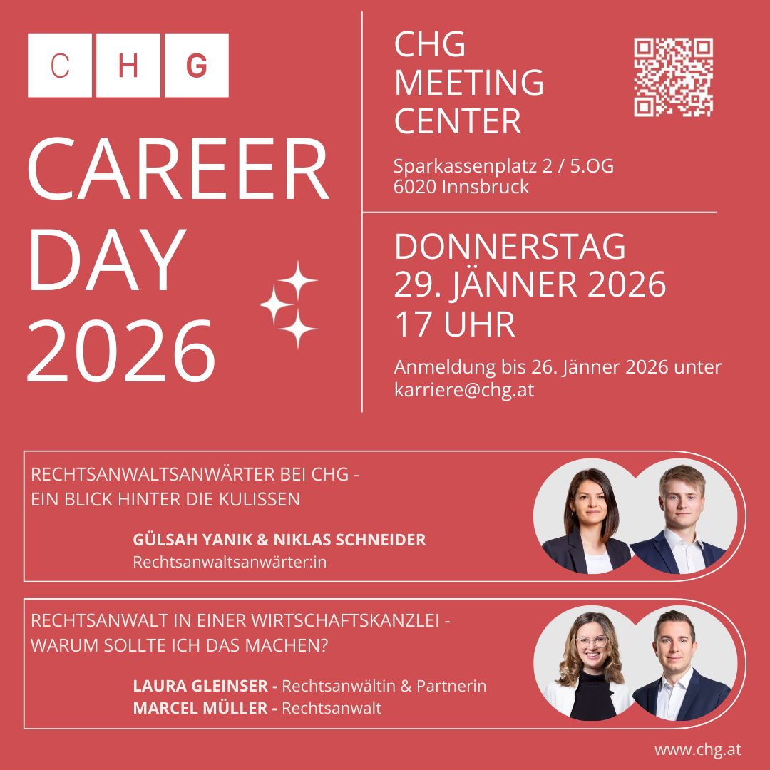 Für die Gründung eines CHG-Standortes unter Einbindung einer renommierten Rechtsanwaltskanzlei in Bregenz suchen wir eine/n Rechtsanwalt/Rechtsanwältin oder erfahrene/r Rechtsanwaltsanwärter/in, der/die diesen neuen Standort aktiv mitgestalten möchte.